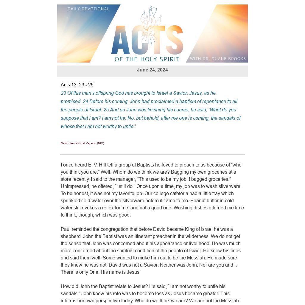 Paul reminded the congregation that before David became King of Israel he was a shepherd. John the Baptist was an itinerant preacher in the wilderness. We do not get the sense that John was concerned about his appearance or livelihood. He was much more concerned about the spiritual condition of the people of Israel. He knew his lines and said them well. Some wanted to make him out to be the Messiah. He made sure they knew he was not. David was not a Savior. Neither was John. Nor are you and I. There is only One. His name is Jesus!