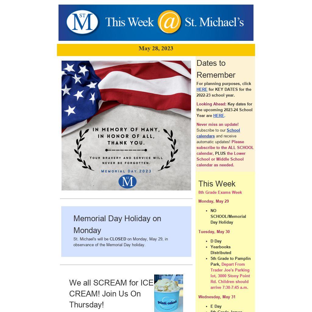St. Michael's will be CLOSED on Monday, May 29, in observance of the Memorial Day holiday.