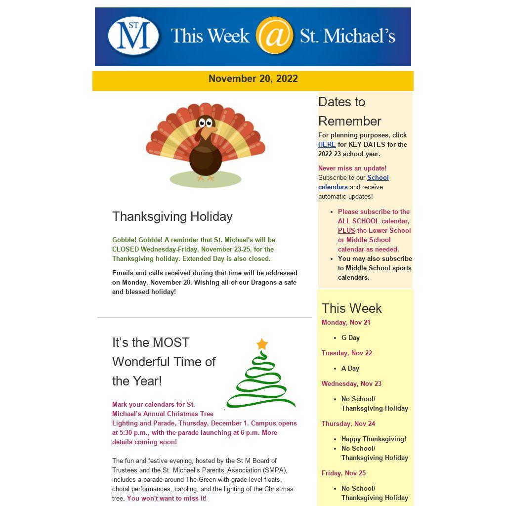Gobble! Gobble! A reminder that St. Michael's will be CLOSED Wednesday-Friday, November 23-25, for the Thanksgiving holiday. Extended Day is also closed.