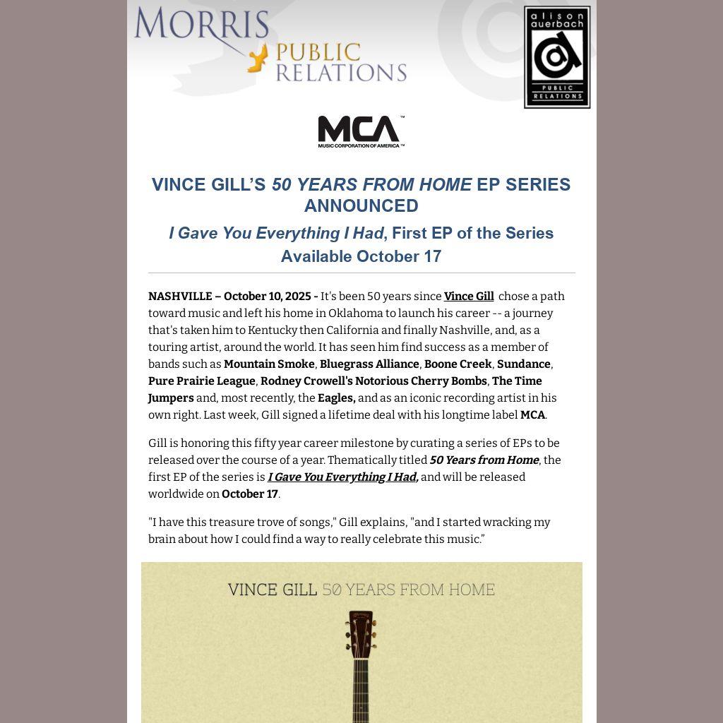 NASHVILLE – October 10, 2025 - It's been 50 years since Vince Gill chose a path toward music and left his home in Oklahoma to launch his career -- a journey that's taken him to Kentucky then California and finally Nashville, and, as a touring artist, around the world. It has seen him find success as a member of bands such as Mountain Smoke, Bluegrass Alliance, Boone Creek, Sundance, Pure Prairie League, Rodney Crowell's Notorious Cherry Bombs, The Time Jumpers and, most recently, the Eagles, and as an iconic recording artist in his own right. Last week, Gill signed a lifetime deal with his longtime label MCA.