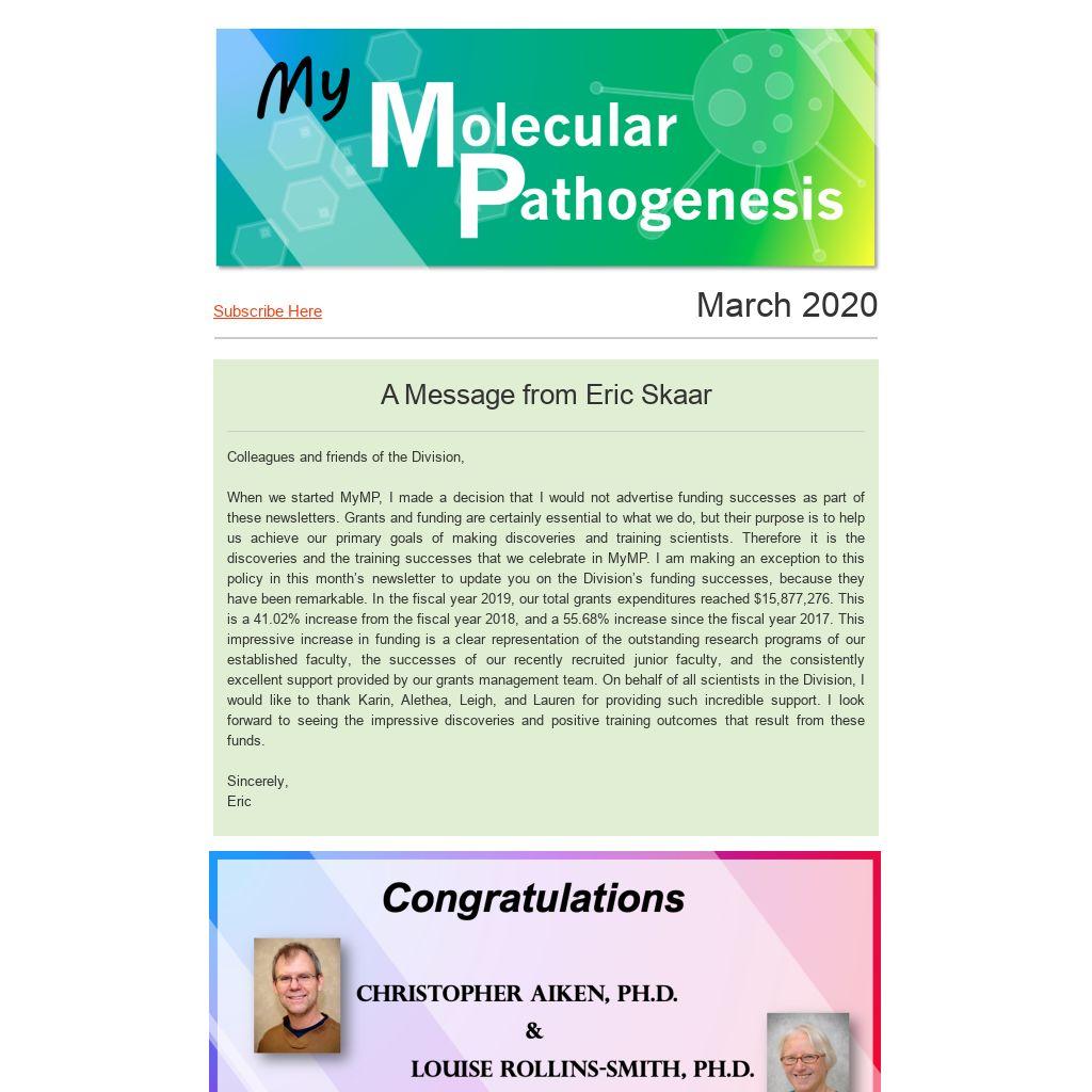 When we started MyMP, I made a decision that I would not advertise funding successes as part of these newsletters. Grants and funding are certainly essential to what we do, but their purpose is to help us achieve our primary goals of making discoveries and training scientists. Therefore it is the discoveries and the training successes that we celebrate in MyMP. I am making an exception to this policy in this month’s newsletter to update you on the Division’s funding successes, because they have been remarkable. In the fiscal year 2019, our total grants expenditures reached $15,877,276. This is a 41.02% increase from the fiscal year 2018, and a 55.68% increase since the fiscal year 2017. This impressive increase in funding is a clear representation of the outstanding research programs of our established faculty, the successes of our recently recruited junior faculty, and the consistently excellent support provided by our grants management team. On behalf of all scientists in the Division, I would like to thank Karin, Alethea, Leigh, and Lauren for providing such incredible support. I look forward to seeing the impressive discoveries and positive training outcomes that result from these funds.