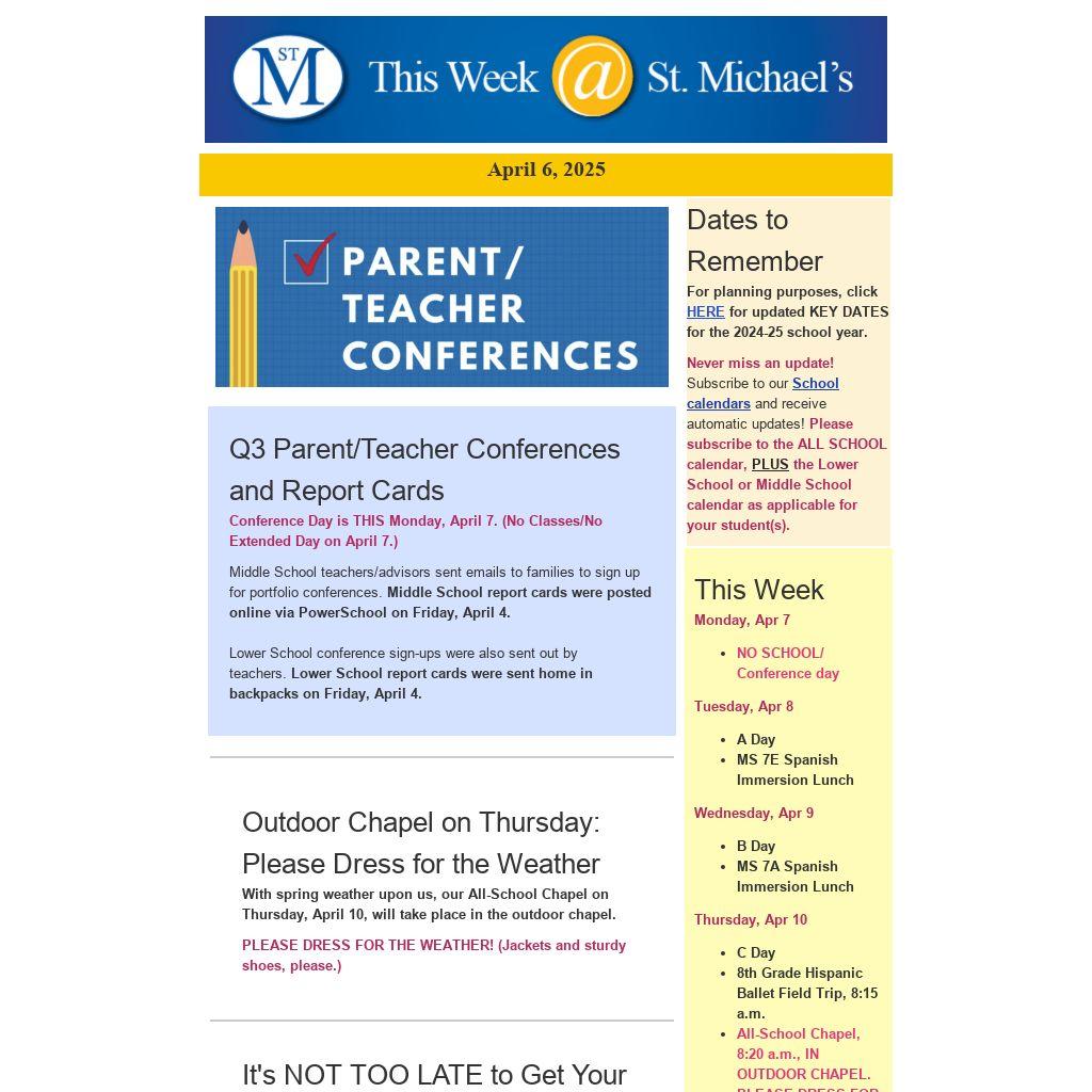 Lower School conference sign-ups were also sent out by teachers. Lower School report cards were sent home in backpacks on Friday, April 4.