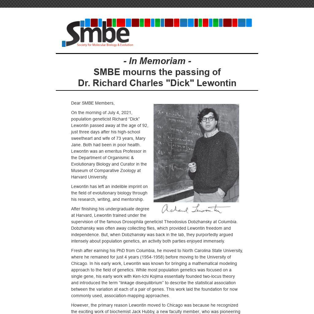 On the morning of July 4, 2021, population geneticist Richard “Dick” Lewontin passed away at the age of 92, just three days after his high-school sweetheart and wife of 73 years, Mary Jane. Both had been in poor health. Lewontin was an emeritus Professor in the Department of Organismic & Evolutionary Biology and Curator in the Museum of Comparative Zoology at Harvard University.