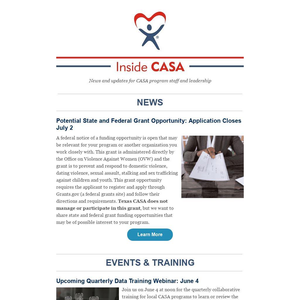 The Texas CASA Grants Department is holding the annual grants webinar on June 30 from 10:00 - 11:30 a.m. In addition to the Health and Human Services Commission (HHSC) and Victims of Crime Act (VOCA) grant applications that are covered each year, we will also discuss: FY26 overview, timesheet requirement, indirect expense allocation policies, budgeting and standardize language, top reasons for "returns," budget revision highlights, documentation review highlights and annual audit highlights.