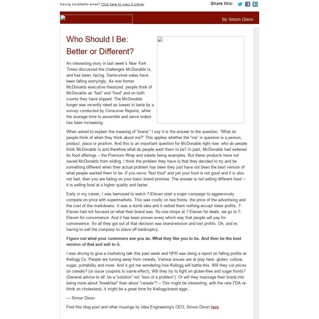 When asked to explain the meaning of “brand,” I say it is the answer to the question, “What do people think of when they think about me?” This applies whether the “me” in question is a person, product, place or position. And this is an important question for McDonalds right now: who do people think McDonalds is and therefore what do people want them to be? In past, McDonalds had widened its food offerings – the Premium Wrap and salads being examples. But these products have not saved McDonalds from sliding. I think the problem they have is that they decided to try and be something different when their actual problem has been they just have not been the best version of what people wanted them to be. If you serve “fast food” and yet your food is not good and it is also not fast, then you are failing on your basic brand promise. The answer is not selling different food – it is selling food at a higher quality and faster.