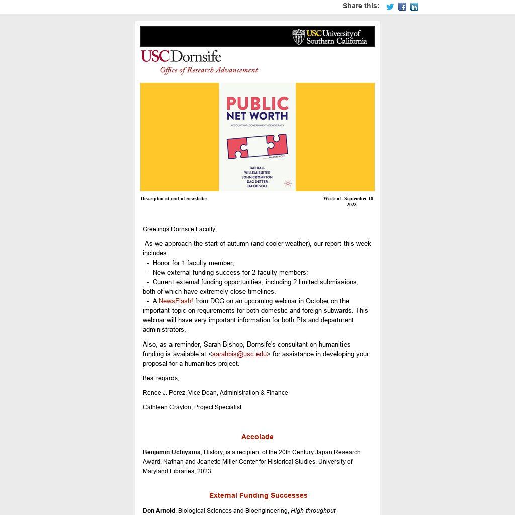 Also, as a reminder, Sarah Bishop, Dornsife's consultant on humanities funding is available at <sarahbis@usc.edu> for assistance in developing your proposal for a humanities project.