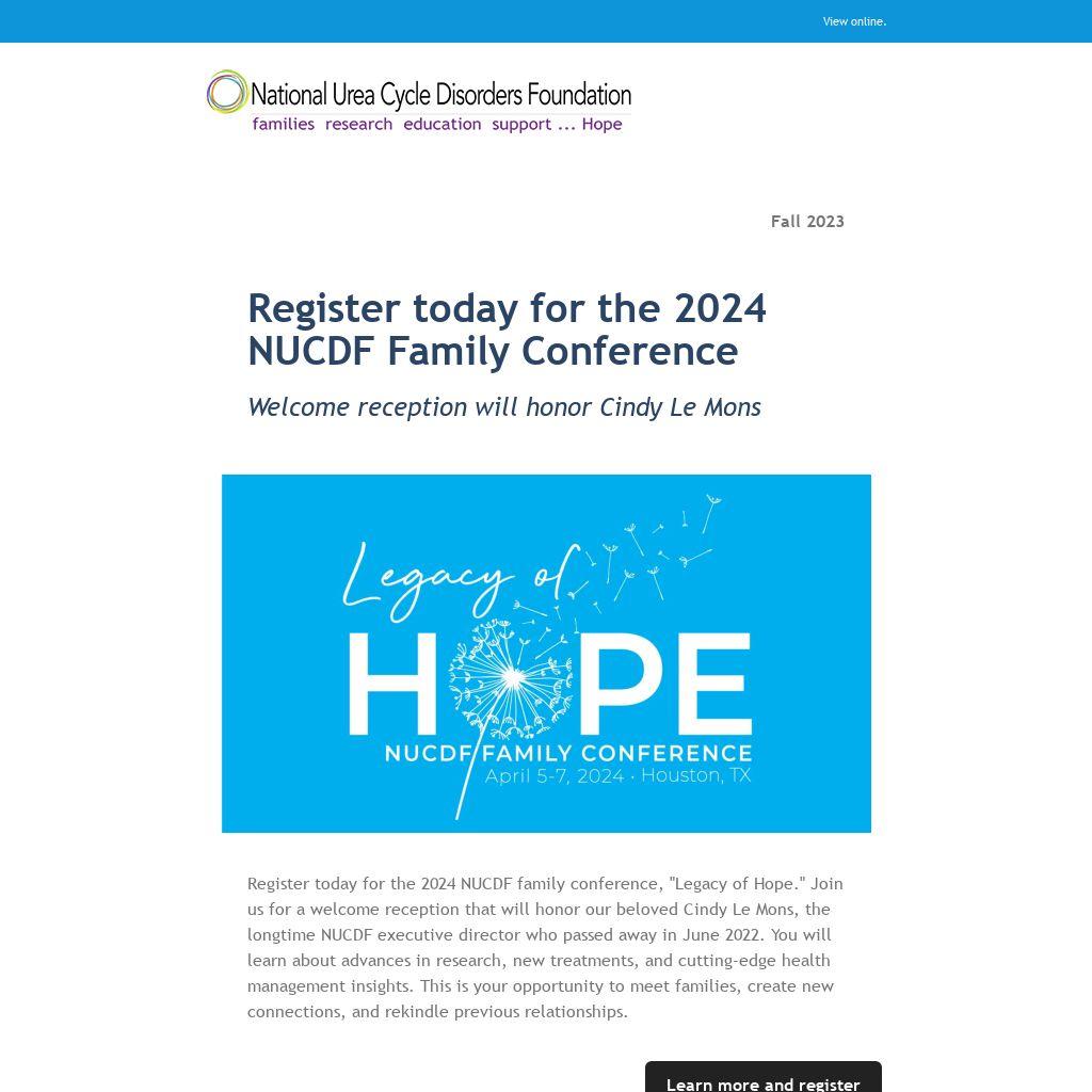 Register today for the 2024 NUCDF family conference, "Legacy of Hope." Join us for a welcome reception that will honor our beloved Cindy Le Mons, the longtime NUCDF executive director who passed away in June 2022. You will learn about advances in research, new treatments, and cutting-edge health management insights. This is your opportunity to meet families, create new connections, and rekindle previous relationships.