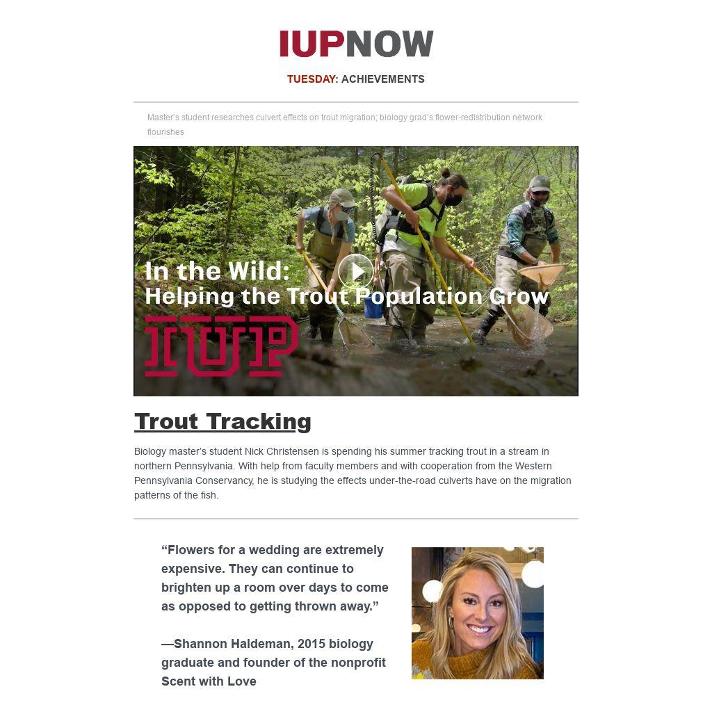 Biology master’s student Nick Christensen is spending his summer tracking trout in a stream in northern Pennsylvania. With help from faculty members and with cooperation from the Western Pennsylvania Conservancy, he is studying the effects under-the-road culverts have on the migration patterns of the fish.