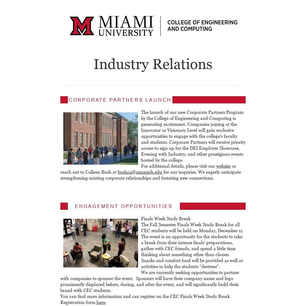 For additional details, please visit our website or reach out to Colleen Bush at bushc4@miamioh.edu for any inquiries. We eagerly anticipate strengthening existing corporate relationships and fostering new connections.