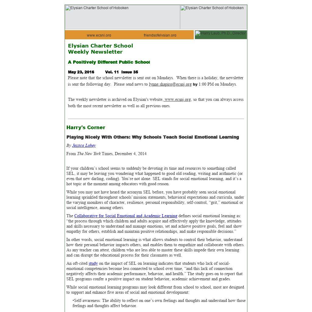 The weekly newsletter is archived on Elysian's website, www.ecsnj.org, so that you can always access both the most recent newsletter as well as all previous ones.