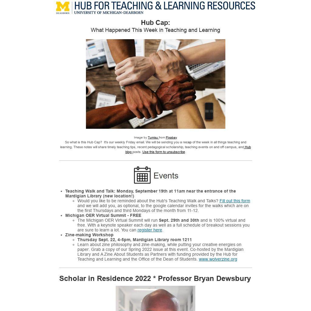So what is this Hub Cap? It's our weekly Friday email. We will be sending you a recap of the week in all things teaching and learning. These notes will share timely teaching tips, recent pedagogical scholarship, teaching events on and off campus, and Hub blog posts. Use this form to unsubscribe.