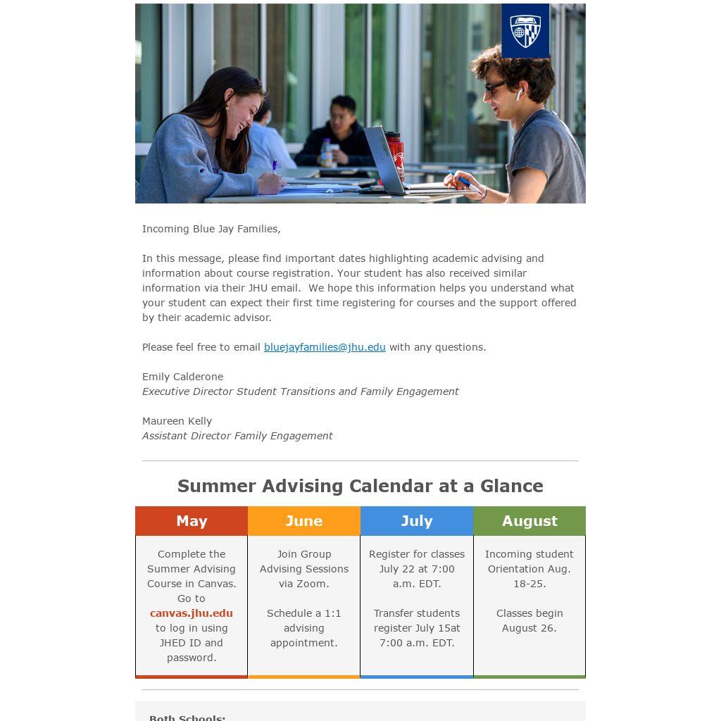 In this message, please find important dates highlighting academic advising and information about course registration. Your student has also received similar information via their JHU email. We hope this information helps you understand what your student can expect their first time registering for courses and the support offered by their academic advisor.