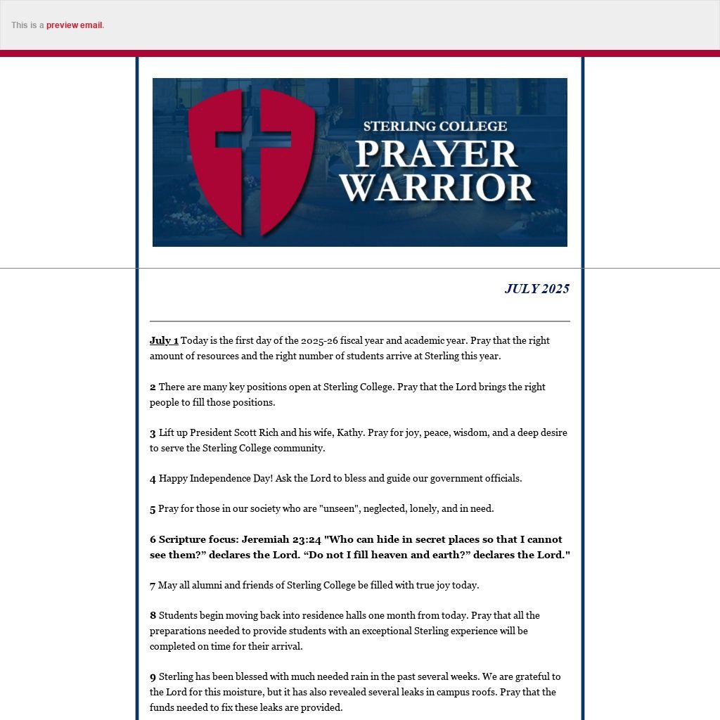 July 1 Today is the first day of the 2025-26 fiscal year and academic year. Pray that the right amount of resources and the right number of students arrive at Sterling this year.