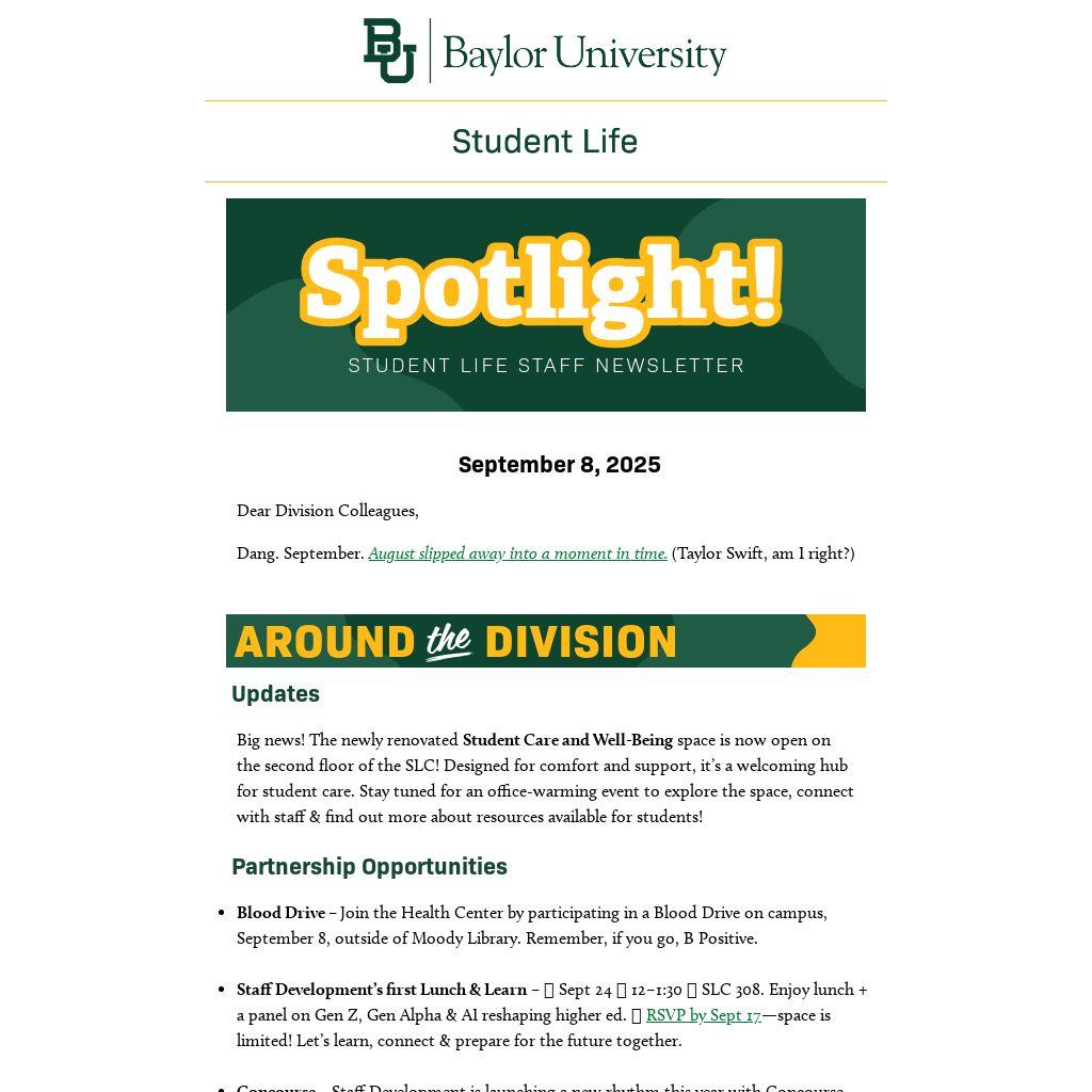 Visit our Division of Student Life webpage to view current openings and help us recruit great people to Baylor! Submit any roles we missed using the button at the end of the email.  Â