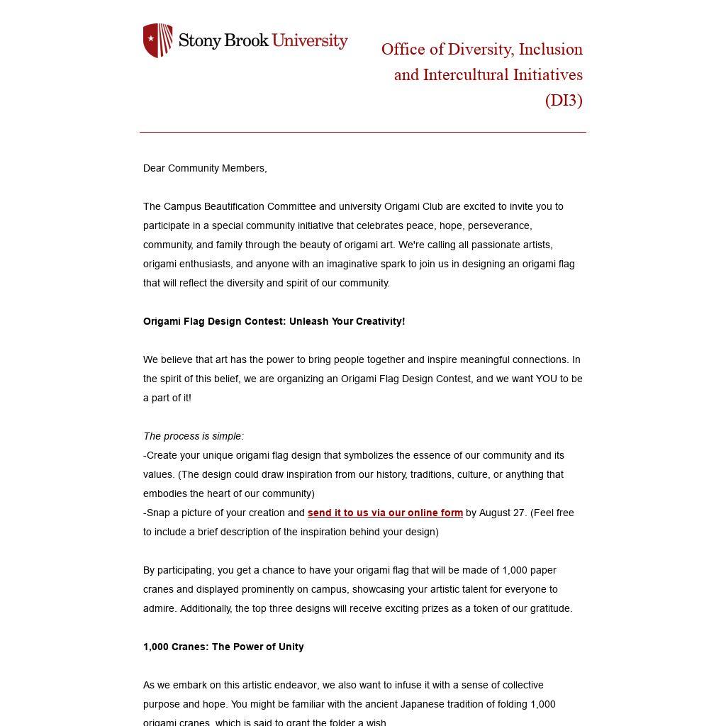 The Campus Beautification Committee and university Origami Club are excited to invite you to participate in a special community initiative that celebrates peace, hope, perseverance, community, and family through the beauty of origami art. We're calling all passionate artists, origami enthusiasts, and anyone with an imaginative spark to join us in designing an origami flag that will reflect the diversity and spirit of our community. Origami Flag Design Contest: Unleash Your Creativity!