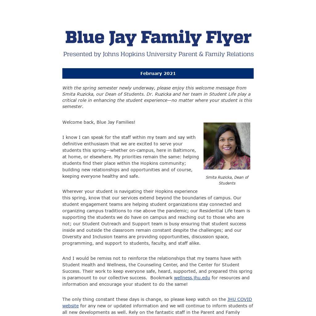 | Over the next several weeks, your Blue Jay will continue to receive specific information regarding protocols, programming, and resources for the spring semester. A listing of recent messages is available for you to peruse at your leisure.