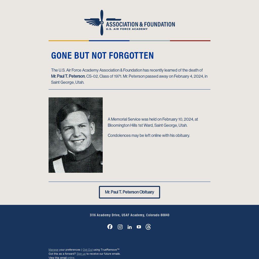 The U.S. Air Force Academy Association & Foundation has recently learned of the death of Mr. Paul T. Peterson, CS-02, Class of 1971. Mr. Peterson passed away on February 4, 2024, in Saint George, Utah.