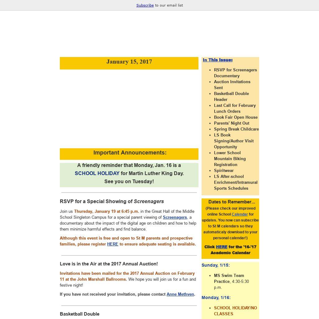 | Dates to Remember...(Please check our improved online School Calendar for updates. You now can subscribe to St M calendars so they automaticaly download to your personal calendar!) Click HERE for the '16-'17 Academic Calendar