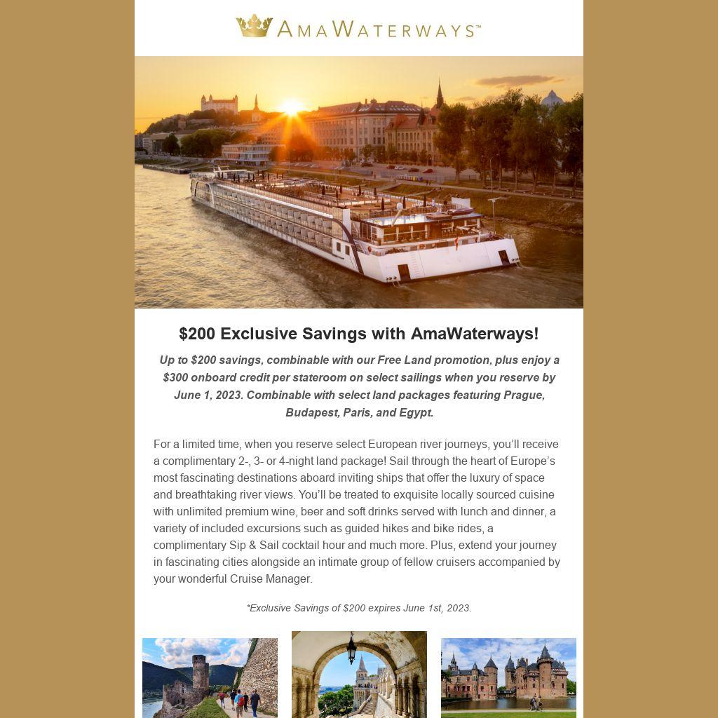 Up to $200 savings, combinable with our Free Land promotion, plus enjoy a $300 onboard credit per stateroom on select sailings when you reserve by June 1, 2023. Combinable with select land packages featuring Prague, Budapest, Paris, and Egypt.