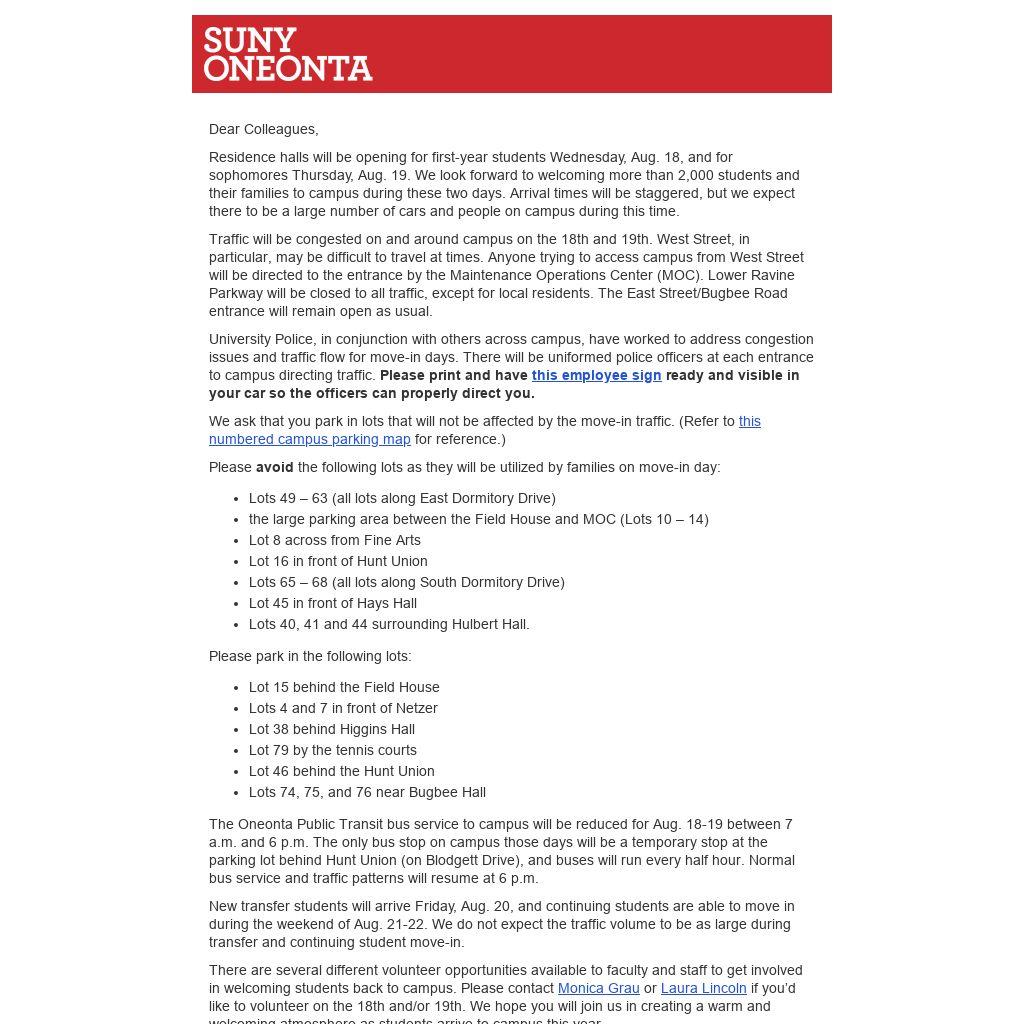 The Oneonta Public Transit bus service to campus will be reduced for Aug. 18-19 between 7 a.m. and 6 p.m. The only bus stop on campus those days will be a temporary stop at the parking lot behind Hunt Union (on Blodgett Drive), and buses will run every half hour. Normal bus service and traffic patterns will resume at 6 p.m.