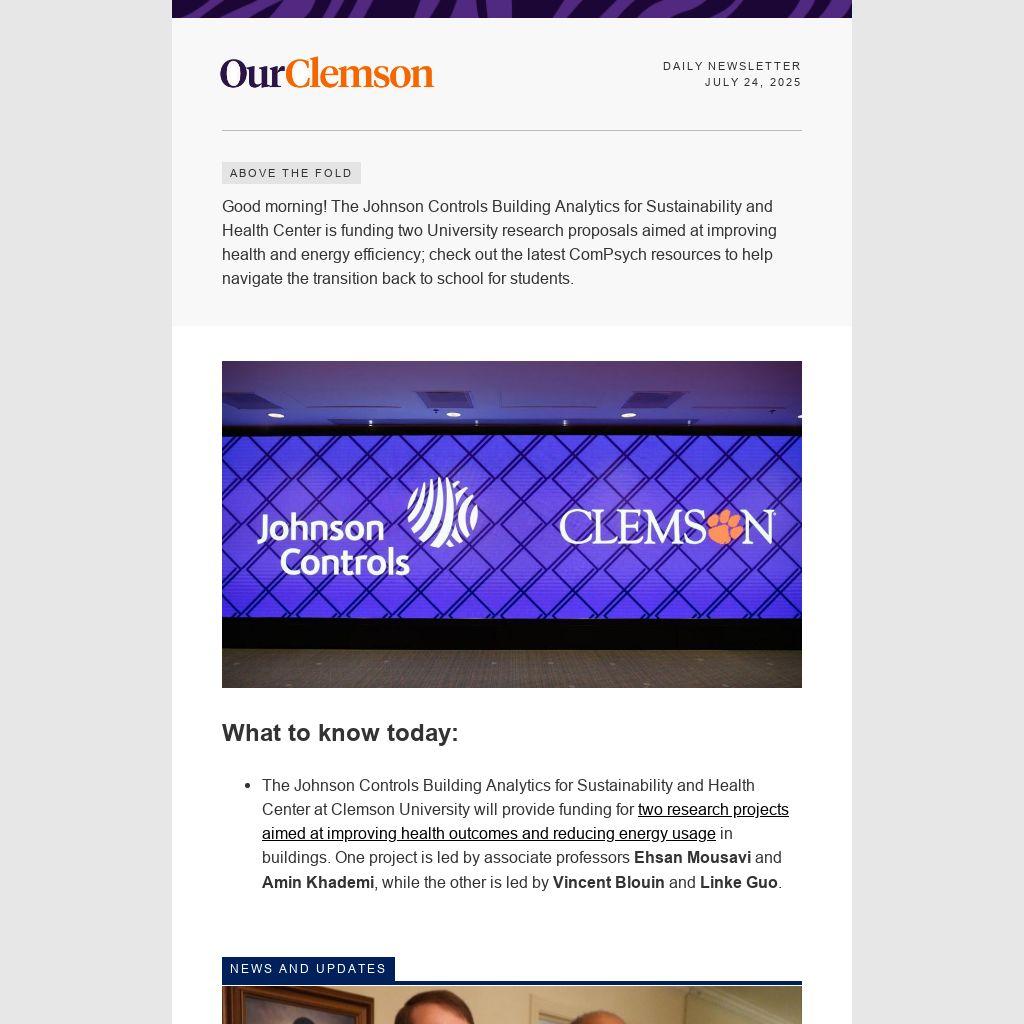 Good morning! The Johnson Controls Building Analytics for Sustainability and Health Center is funding two University research proposals aimed at improving health and energy efficiency; check out the latest ComPsych resources to help navigate the transition back to school for students.