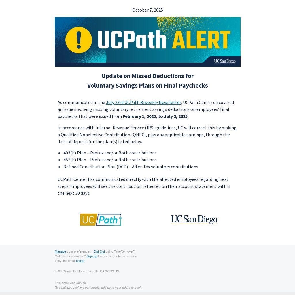 As communicated in the July 23rd UCPath Biweekly Newsletter, UCPath Center discovered an issue involving missing voluntary retirement savings deductions on employees’ final paychecks that were issued from February 1, 2025, to July 2, 2025.