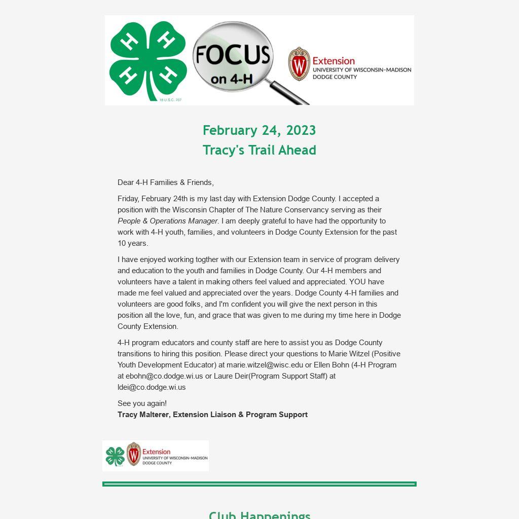 Friday, February 24th is my last day with Extension Dodge County. I accepted a position with the Wisconsin Chapter of The Nature Conservancy serving as their People & Operations Manager. I am deeply grateful to have had the opportunity to work with 4-H youth, families, and volunteers in Dodge County Extension for the past 10 years.