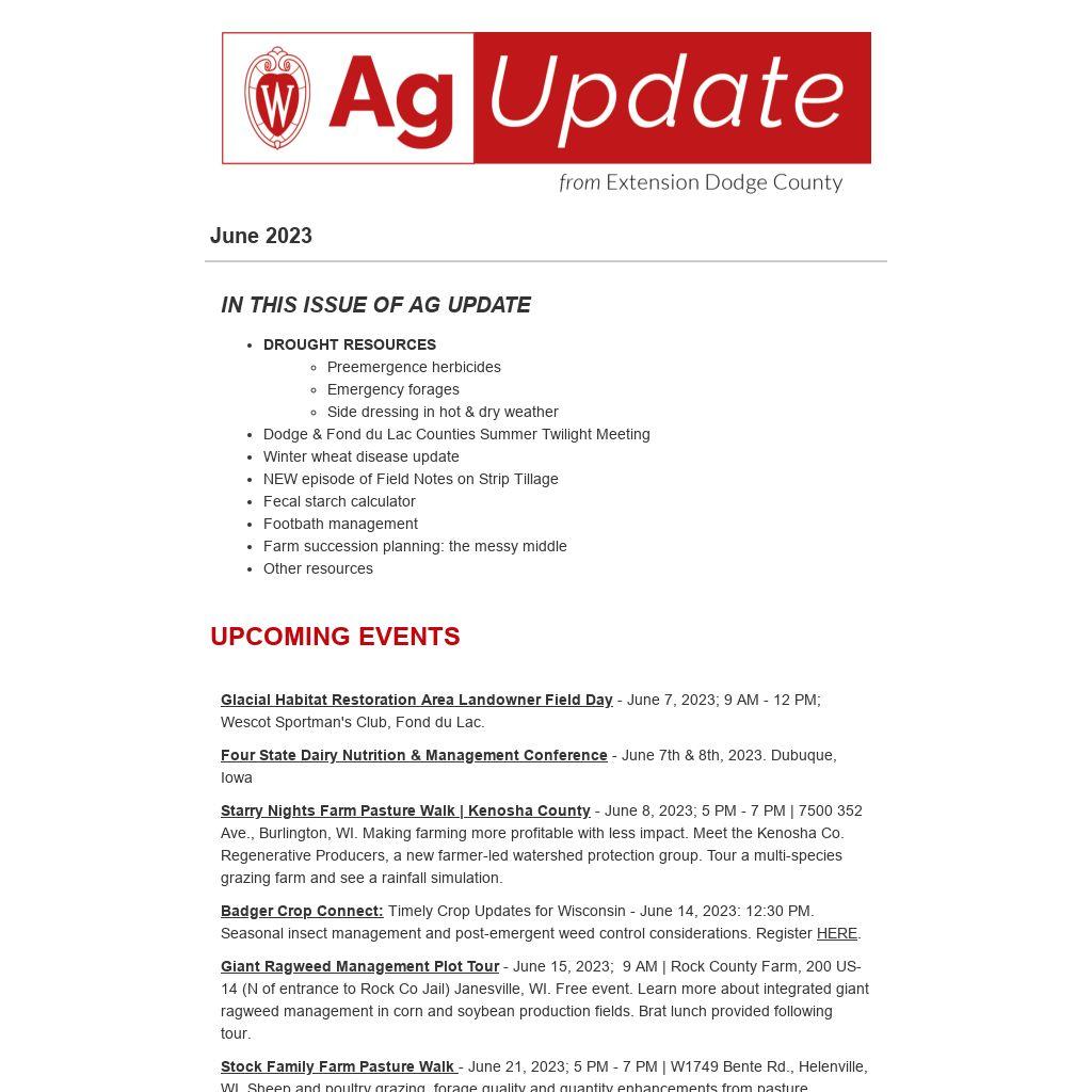 Badger Crop Connect: Timely Crop Updates for Wisconsin - June 14, 2023: 12:30 PM. Seasonal insect management and post-emergent weed control considerations. Register HERE.