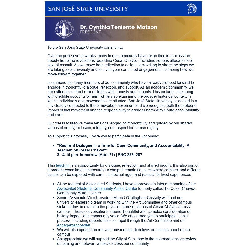 Over the past several weeks, many in our community have taken time to process the deeply troubling revelations regarding César Chávez, including serious allegations of sexual assault. As we move from reflection to action, I am writing to share the steps we are taking as a university and to invite your continued engagement in shaping how we move forward together.