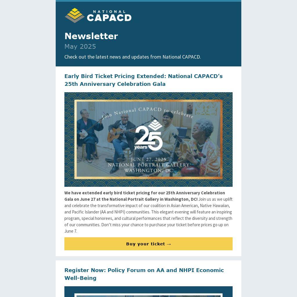 Early Bird Ticket Pricing Extended: National CAPACD’s 25th Anniversary Celebration Gala |