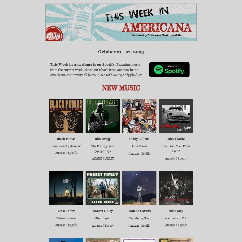 This Week in Americana is on Spotify. Featuring music from the current week, check out what's fresh and new in the Americana community all in one place with our Spotify playlist!