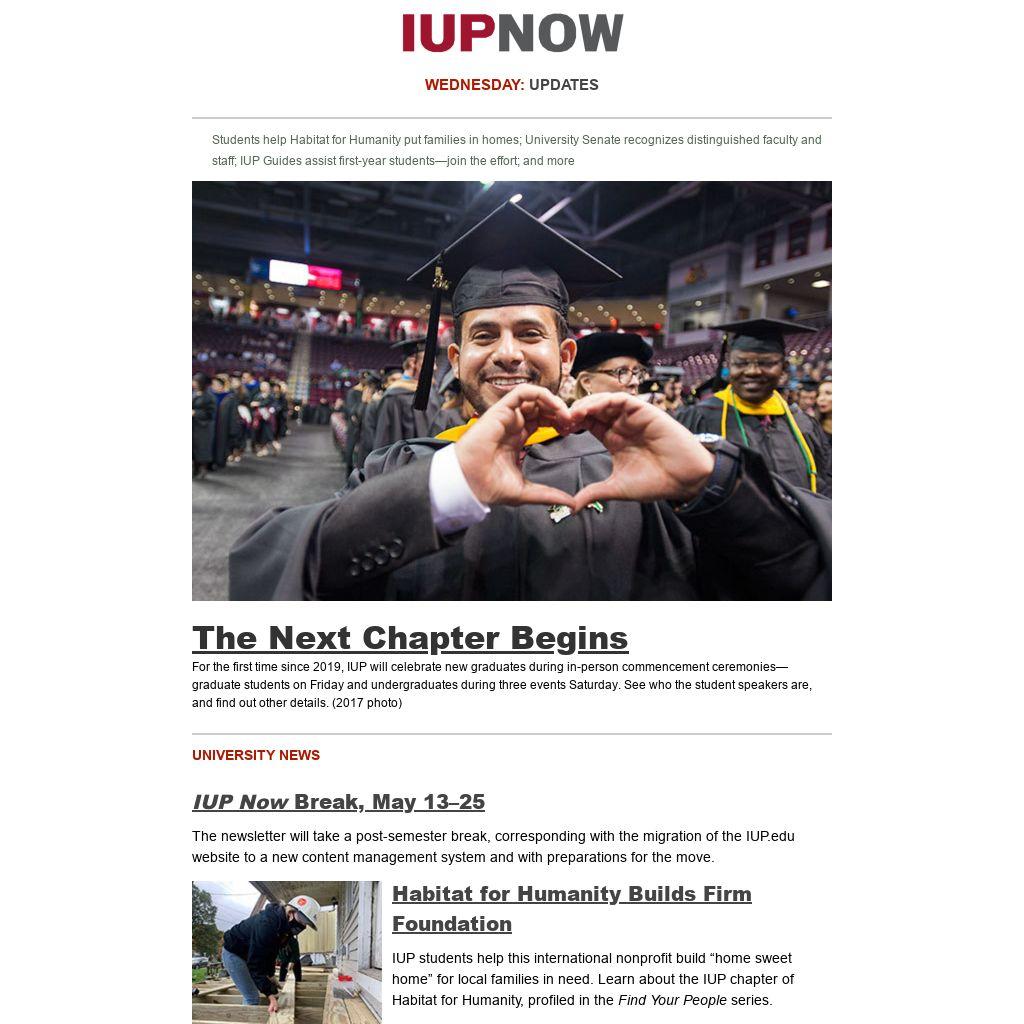 The newsletter will take a post-semester break, corresponding with the migration of the IUP.edu website to a new content management system and with preparations for the move.