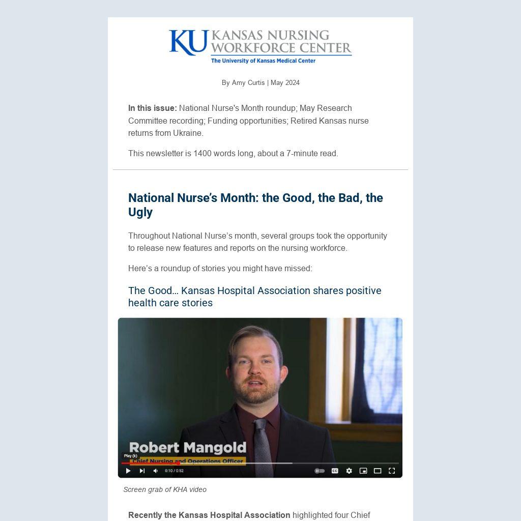 In this issue: National Nurse's Month roundup; May Research Committee recording; Funding opportunities; Retired Kansas nurse returns from Ukraine.
