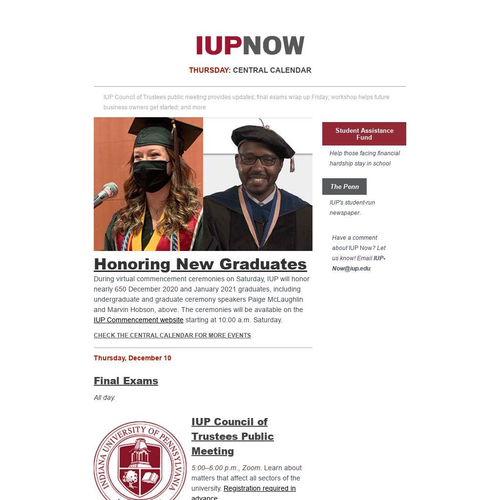Distributed to IUP employees and students four days a week, IUP Now is the official newsletter of Indiana University of Pennsylvania. It features news from across the IUP website, compiled by the Division of Marketing and Communications. Find out how to get your news and events in IUP Now.