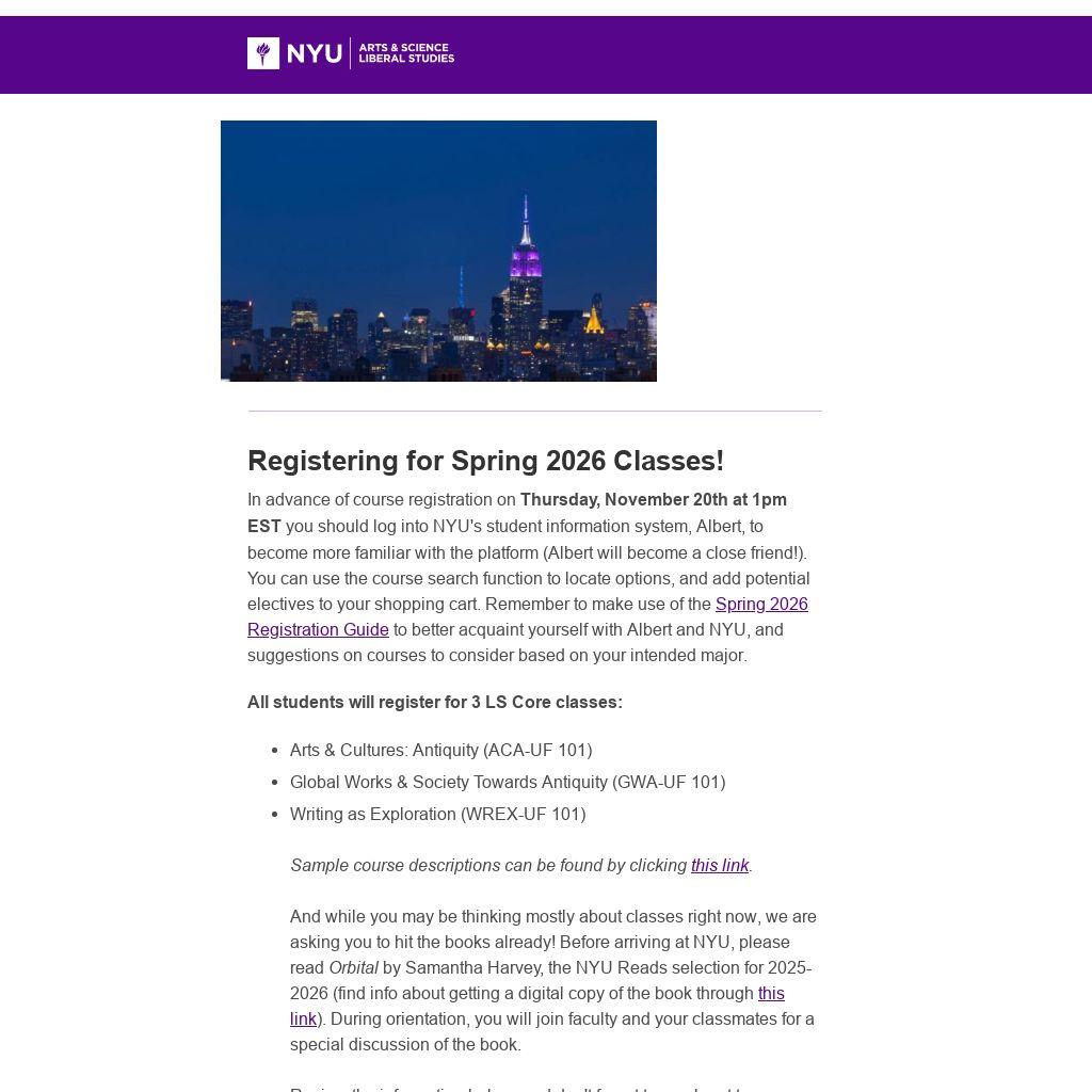 Registering for Spring 2026 Classes!In advance of course registration on Thursday, November 20th at 1pm EST you should log into NYU's student information system, Albert, to become more familiar with the platform (Albert will become a close friend!). You can use the course search function to locate options, and add potential electives to your shopping cart. Remember to make use of the Spring 2026 Registration Guide to better acquaint yourself with Albert and NYU, and suggestions on courses to consider based on your intended major.
