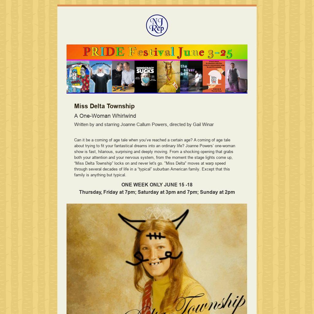 Can it be a coming of age tale when you’ve reached a certain age? A coming of age tale about trying to fit your fantastical dreams into an ordinary life? Joanne Powers’ one-woman show is fast, hilarious, surprising and deeply moving. From a shocking opening that grabs both your attention and your nervous system, from the moment the stage lights come up, “Miss Delta Township” locks on and never let's go. "Miss Delta" moves at warp speed through several decades of life in a “typical” suburban American family. Except that this family is anything but typical.