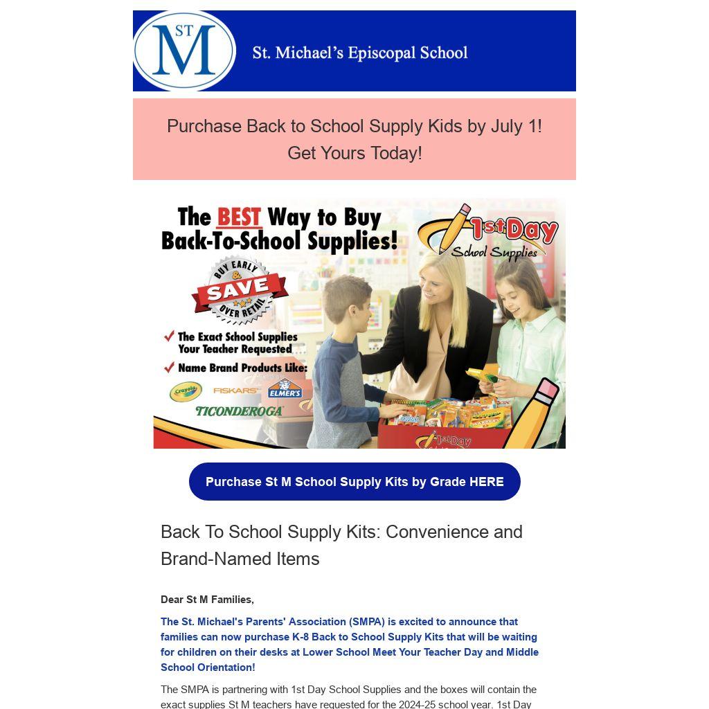 The St. Michael's Parents' Association (SMPA) is excited to announce that families can now purchase K-8 Back to School Supply Kits that will be waiting for children on their desks at Lower School Meet Your Teacher Day and Middle School Orientation!