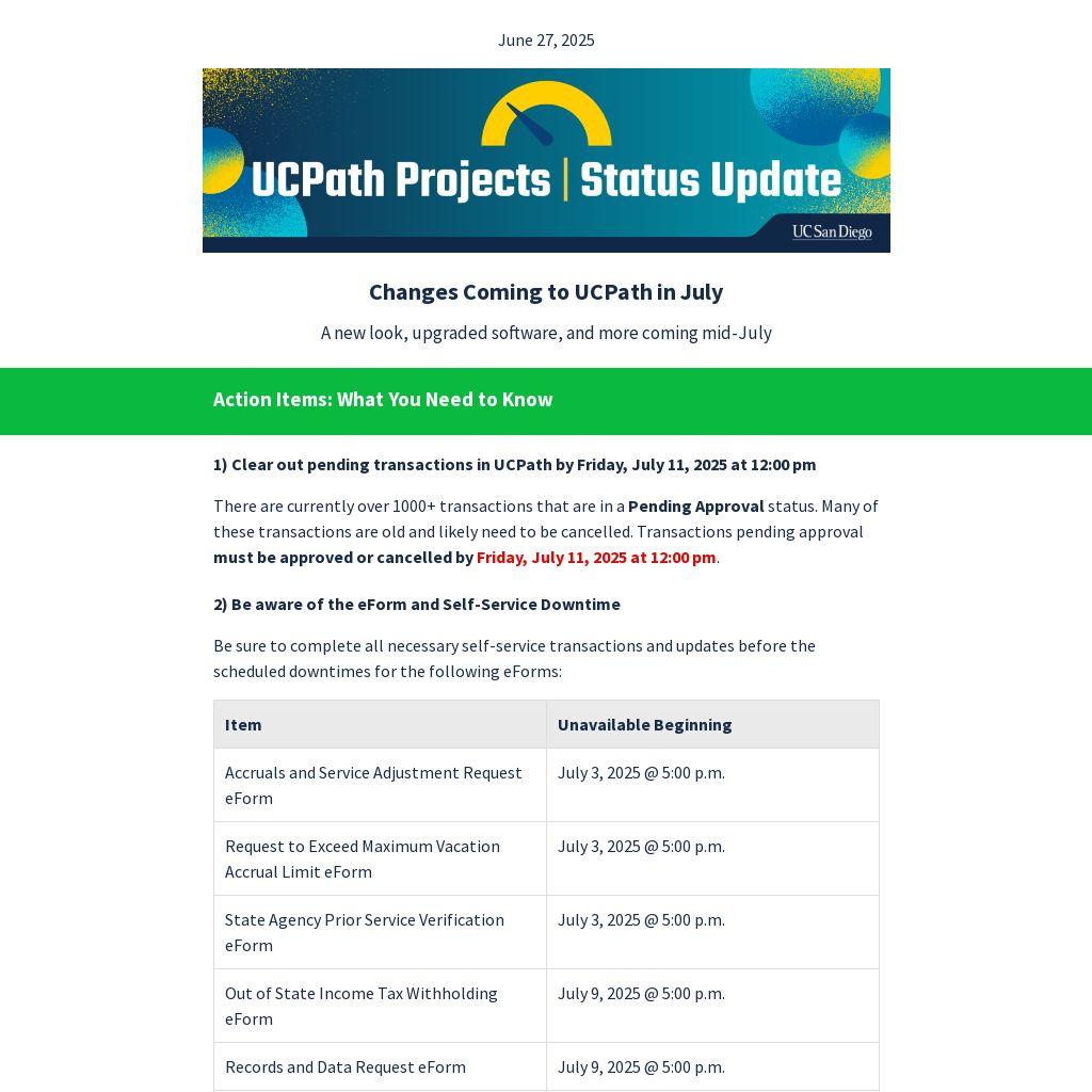 UCPath will be unavailable from Friday, July 11, 2025 at 12:00 pm to Monday, July 14, 2025 at 6:00 am to implement the July Release projects. During the scheduled downtime, employees, managers, and transactors will not have access to the system.