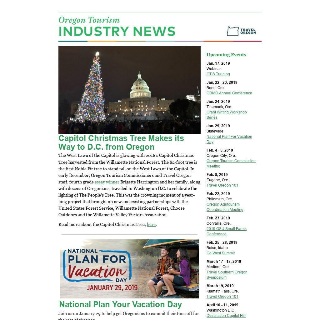Capitol Christmas Tree Makes its Way to D.C. from Oregon The West Lawn of the Capitol is glowing with 2018’s Capitol Christmas Tree harvested from the Willamette National Forest. The 82-foot tree is the first Noble Fir tree to stand tall on the West Lawn of the Capitol. In early December, Oregon Tourism Commissioners and Travel Oregon staff, fourth grade essay winner Brigette Harrington and her family, along with dozens of Oregonians, traveled to Washington D.C. to celebrate the lighting of The People’s Tree. This was the crowning moment of a year-long project that brought on new and existing partnerships with the United States Forest Service, Willamette National Forest, Choose Outdoors and the Willamette Valley Visitors Association.