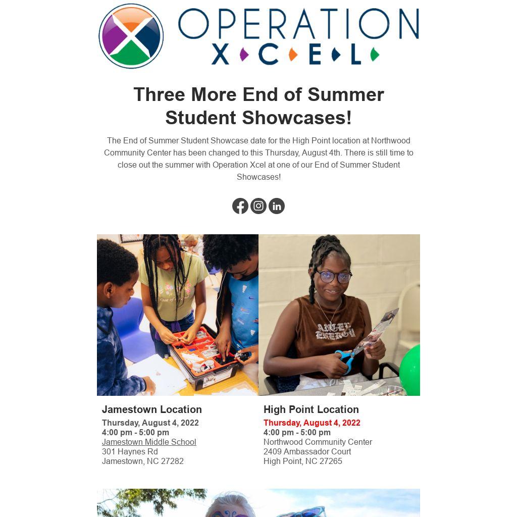 The End of Summer Student Showcase date for the High Point location at Northwood Community Center has been changed to this Thursday, August 4th. There is still time to close out the summer with Operation Xcel at one of our End of Summer Student Showcases!