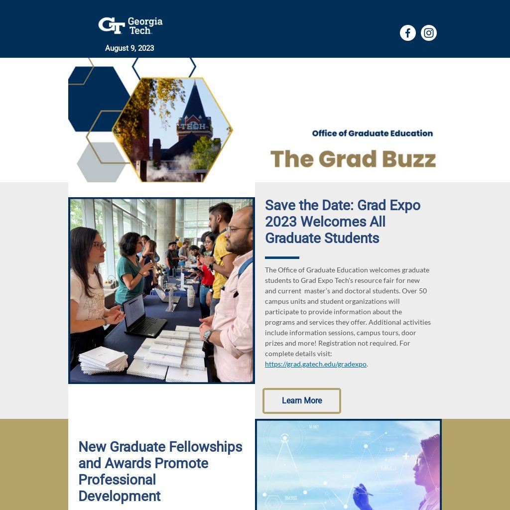 The Office of Graduate Education welcomes graduate students to Grad Expo Tech's resource fair for new and current master’s and doctoral students. Over 50 campus units and student organizations will participate to provide information about the programs and services they offer. Additional activities include information sessions, campus tours, door prizes and more! Registration not required. For complete details visit: https://grad.gatech.edu/gradexpo.