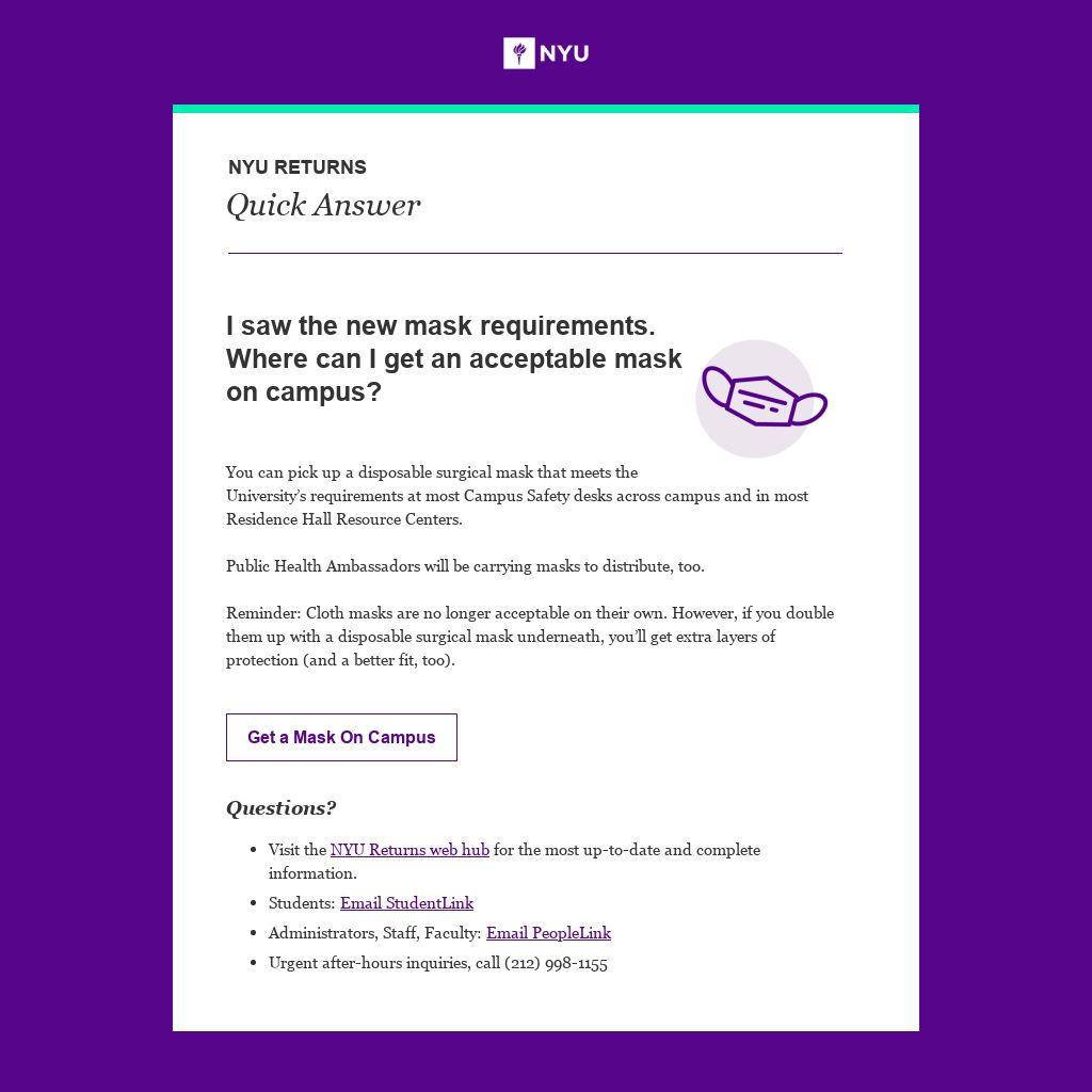You can pick up a disposable surgical mask that meets the University’s requirements at most Campus Safety desks across campus and in most Residence Hall Resource Centers.