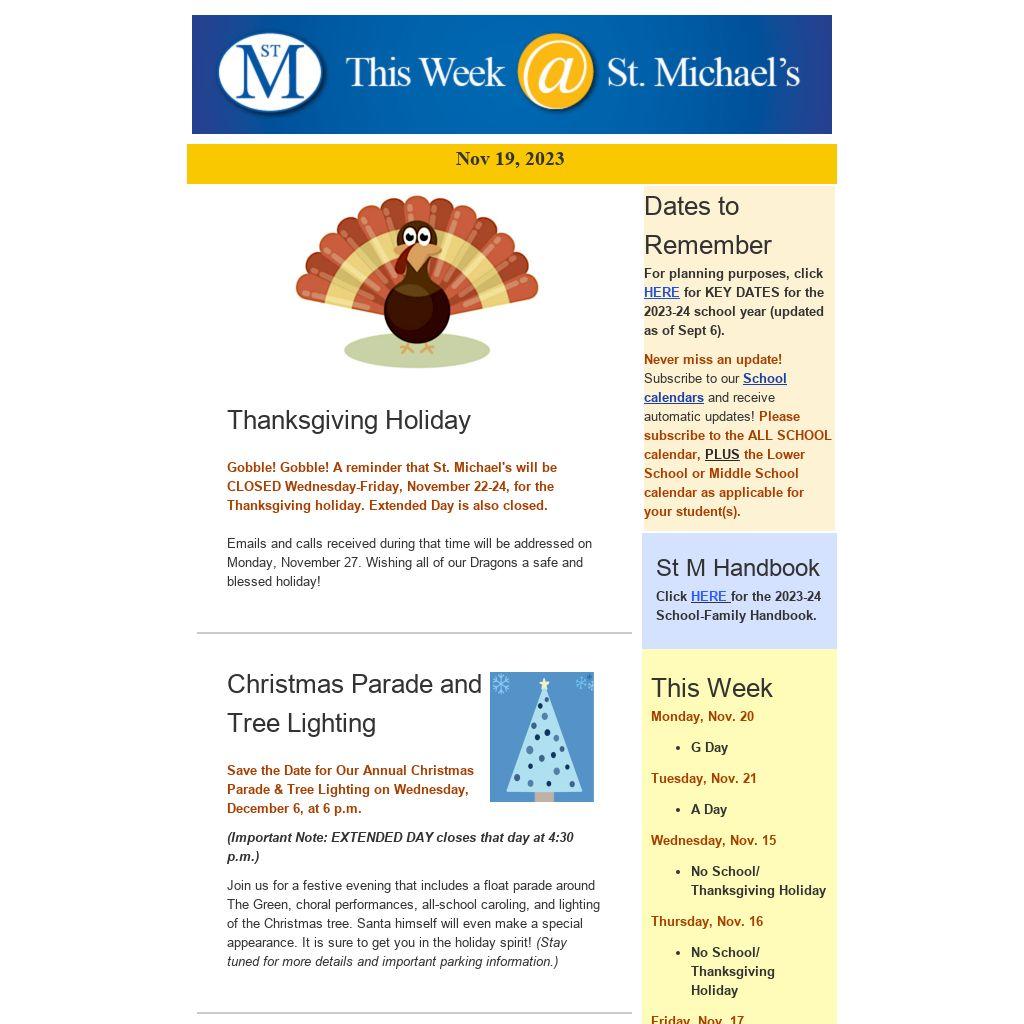 Gobble! Gobble! A reminder that St. Michael's will be CLOSED Wednesday-Friday, November 22-24, for the Thanksgiving holiday. Extended Day is also closed.
