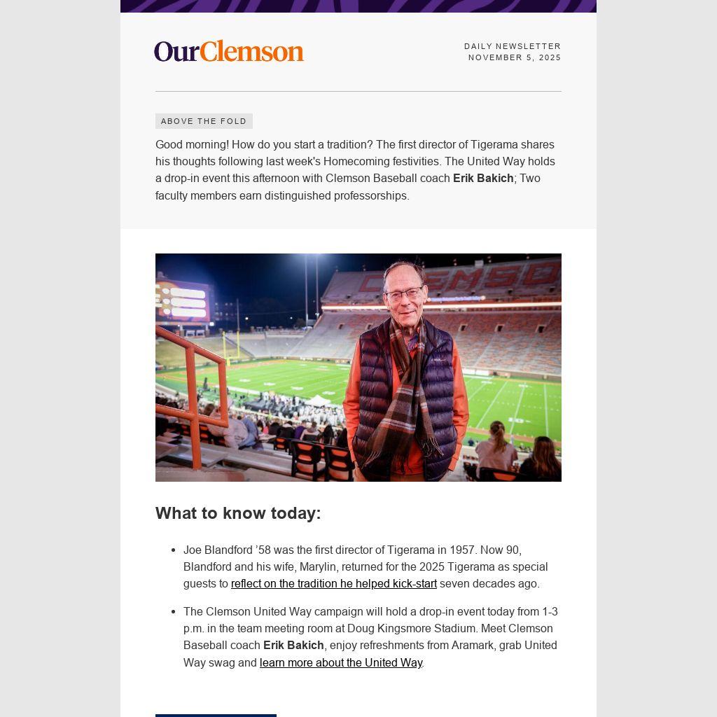 Good morning! How do you start a tradition? The first director of Tigerama shares his thoughts following last week's Homecoming festivities. The United Way holds a drop-in event this afternoon with Clemson Baseball coach Erik Bakich; Two faculty members earn distinguished professorships.