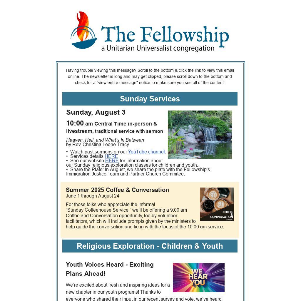 • Share the Plate: In August, we share the plate with the Fellowship's Immigration Justice Team and Partner Church Commitee.