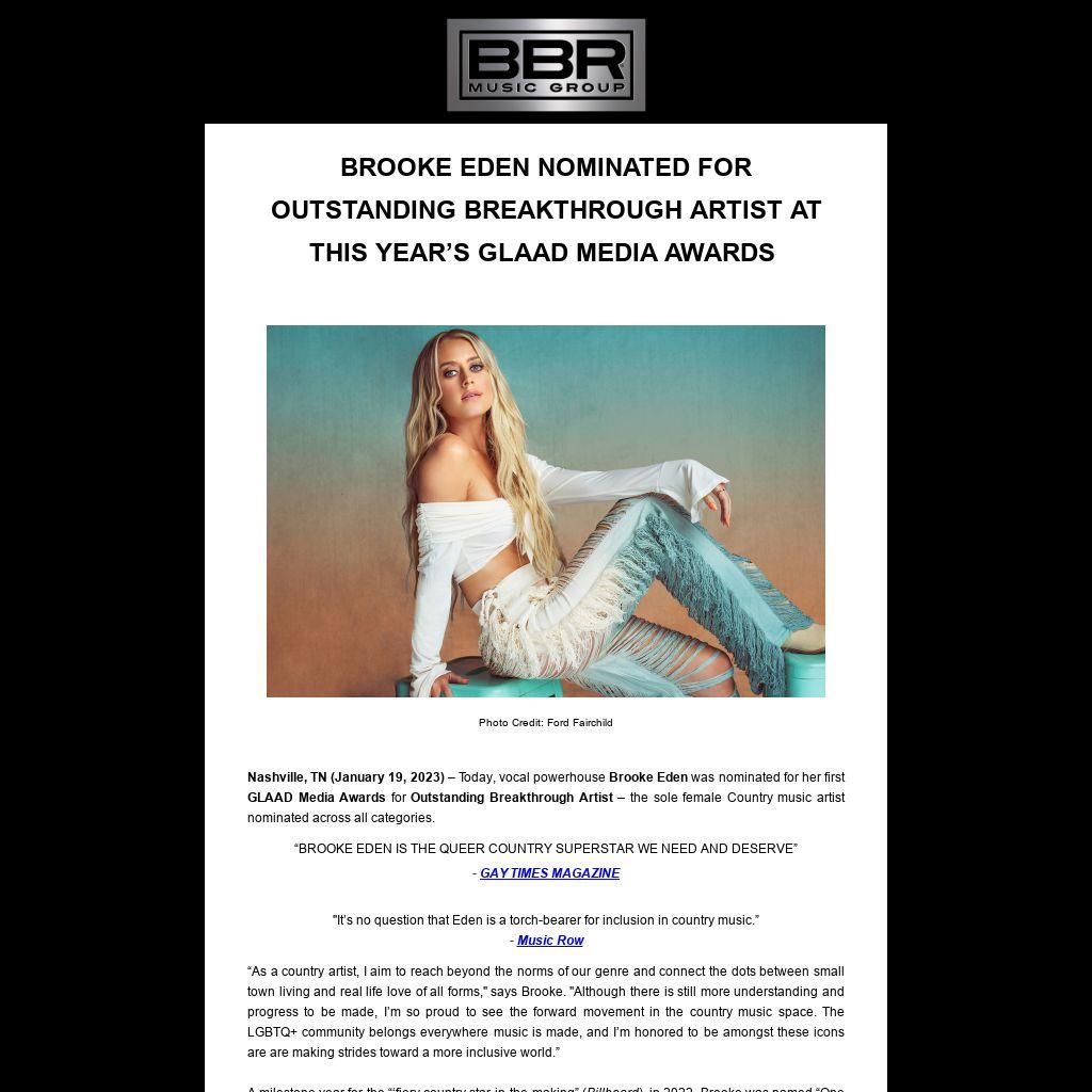 Nashville, TN (January 19, 2023) – Today, vocal powerhouse Brooke Eden was nominated for her first GLAAD Media Awards for Outstanding Breakthrough Artist – the sole female Country music artist nominated across all categories.