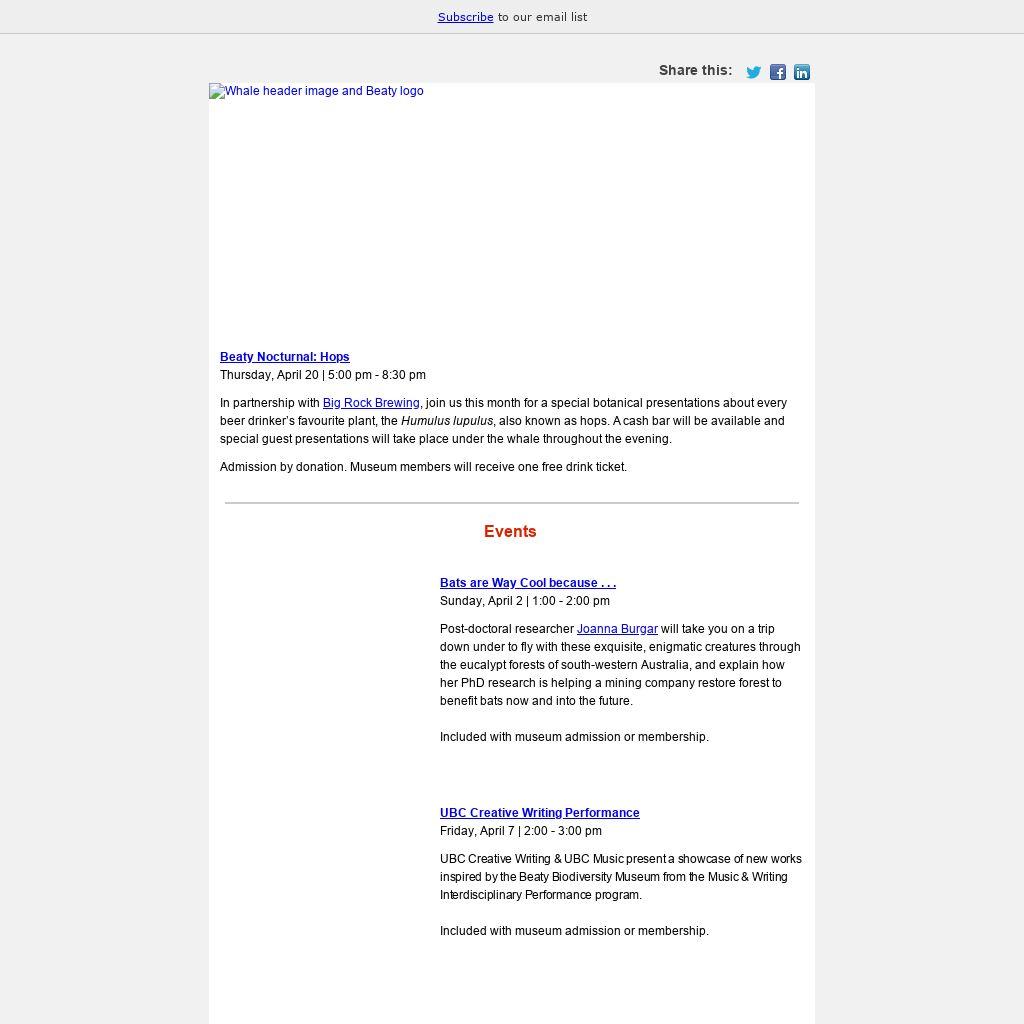 In partnership with Big Rock Brewing, join us this month for a special botanical presentations about every beer drinker’s favourite plant, the Humulus lupulus, also known as hops. A cash bar will be available and special guest presentations will take place under the whale throughout the evening.