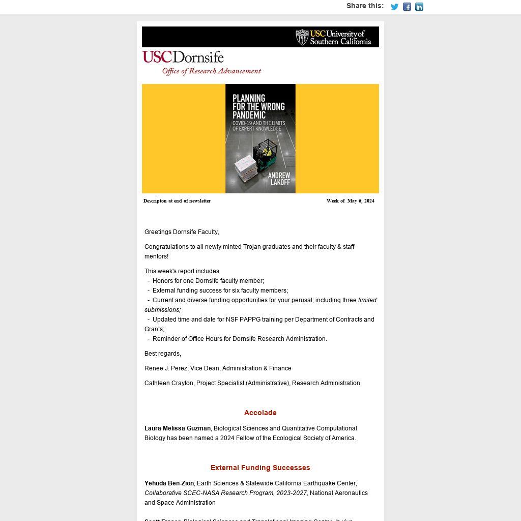 This week's report includes - Honors for one Dornsife faculty member; - External funding success for six faculty members; - Current and diverse funding opportunities for your perusal, including three limited submissions; - Updated time and date for NSF PAPPG training per Department of Contracts and Grants; - Reminder of Office Hours for Dornsife Research Administration.