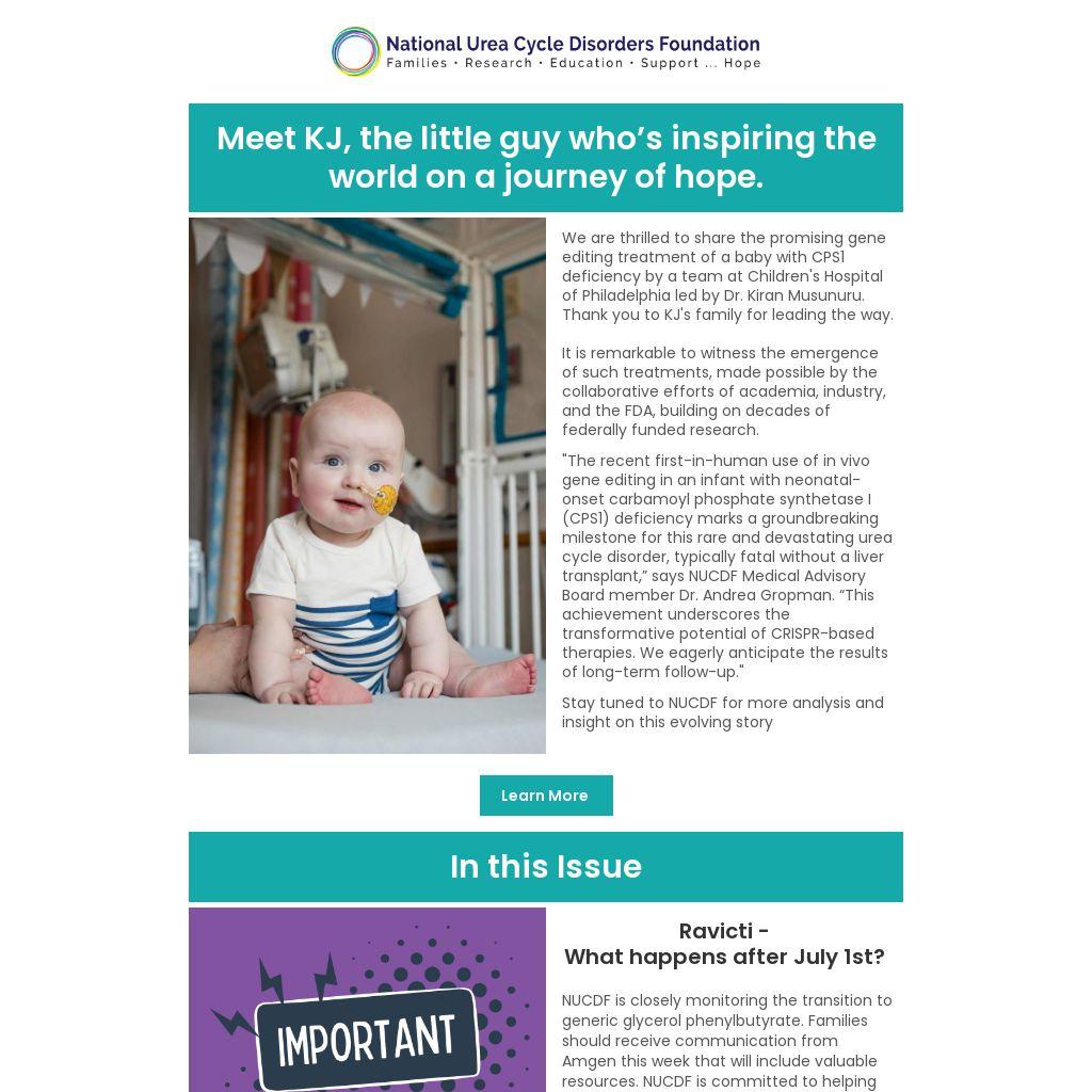 "The recent first-in-human use of in vivo gene editing in an infant with neonatal-onset carbamoyl phosphate synthetase I (CPS1) deficiency marks a groundbreaking milestone for this rare and devastating urea cycle disorder, typically fatal without a liver transplant,” says NUCDF Medical Advisory Board member Dr. Andrea Gropman. “This achievement underscores the transformative potential of CRISPR-based therapies. We eagerly anticipate the results of long-term follow-up."
