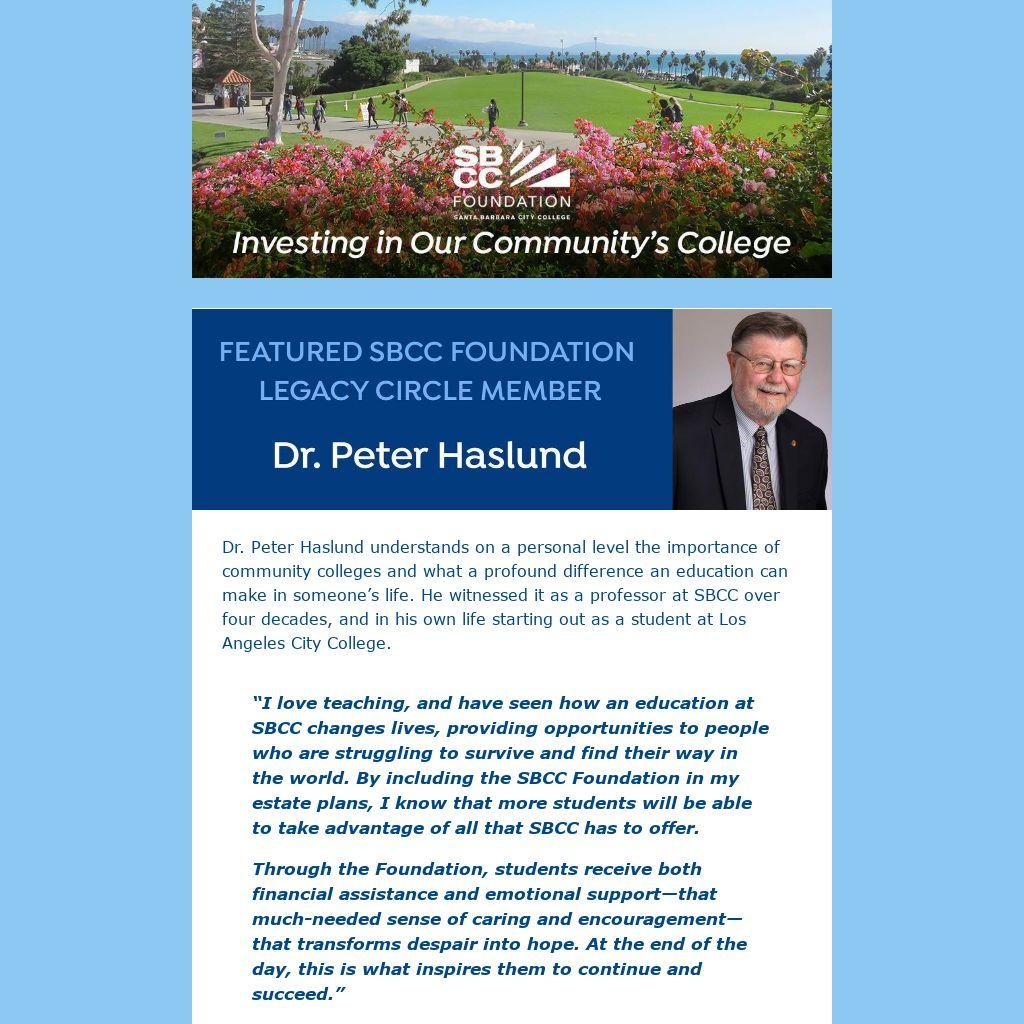 | We are grateful to forward-thinking legacy circle members like Dr. Haslund who have made a planned gift to the SBCC Foundation, ensuring that the college and its students will continue to thrive for many years to come.